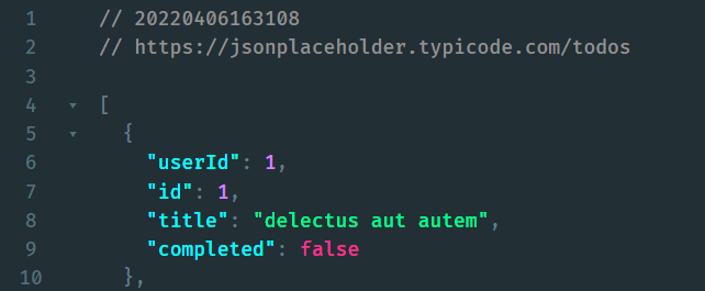 This endpoint returns a list of fake todos, each having some properties. So how exactly we can access this data through JavaScript? Take a look at the following example: