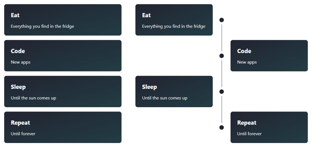 On small screen devices, we don't have enough space to display the classical timeline alignment of elements without distorting them, so we simply display them as a list of items. The above CSS rules will create the following layout: